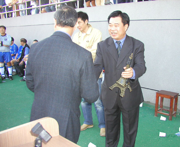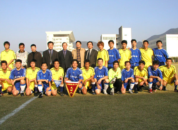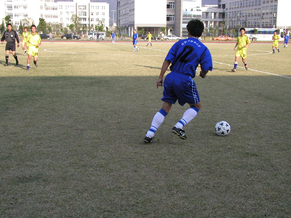 运动会的硝烟在我院体育场刚刚熄灭,11月15日,我院红白相间的体育场又迎来一场足球友谊赛——法国华人华侨会足球队对阵由温师院和我院学生组成的大学生足球联队。这场比赛由温州市侨办“牵线”,旨在以球会友,增进友谊。赛前举行了简短的开幕式,市侨办领导主持仪式,温师院党委领导致欢迎词,双方队伍还互相交换了礼物。