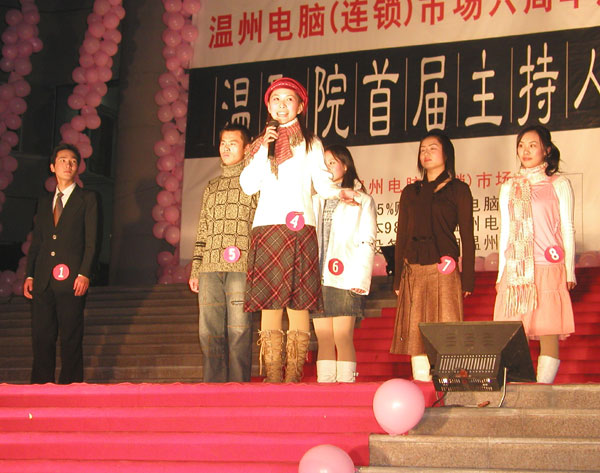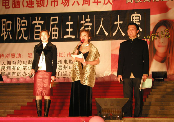 12月16日晚,由我院学生会主办,人文系团学组织承办的温职院首届主持人大赛在图书信息中心楼前拉开了帷幕。此次比赛共有16名同学报名参赛。为了使比赛更公正和公平,大赛组委会特别邀请了温州电台的主持人担任评委。晚会的主持人也是由温州电台《瓯江夜话》栏目著名主持人胡红女士和我院学生共同担纲。