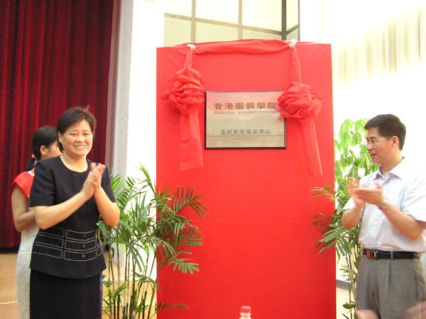 6月26日香港服装学院和温州职业技术学院合作揭牌仪式在我院学术报告厅隆重举行。市府秘书长厉秀珍、市劳动局局长何素凤、温州服装商会会长陈敏、香港服装学院副院长周世康以及我院院长周锦成出席了揭牌仪式。我院副院长吴金法主持了仪式。温州市服装界企业家、温州新闻界记者、各中等职业技术学校领导和老师也都应邀参加了揭牌仪式。