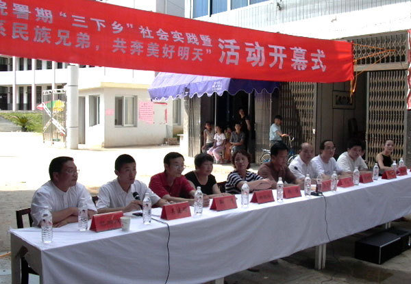 7月4日下午2:00,我院在文成县西坑镇西坑中学校门口举行了温职院2004年暑期”三下乡”社会实践暨“情系民族兄弟,共奔美好明天”活动开幕式。文成县委宣传部部长蒋志学,文成县西坑镇党委副书记钟爱华,共青团文成县委副书记周琦峰,我院党委委员、副院长蓝玉景,文成县西坑镇副镇长包瑞南,文成县西坑镇党委委员蔡晓艳等领导应邀在主席台上列席。