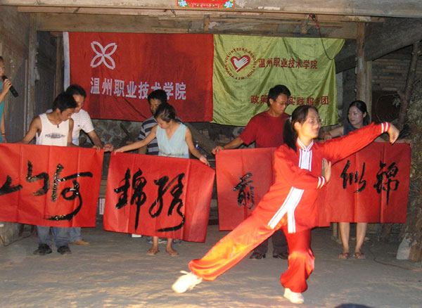 7月14日晚,由我院实践队与西坑镇政府共同主办的“百村整治、十村示范”“世界人口日”暨我院暑期社会实践汇报演出晚会在位于西坑镇的文成县第二希望小学里隆重举行。此次晚会是该团同学自编、自导、自演慰问演出的第三站,也是联合当地举行大型环保宣传的一次盛会。