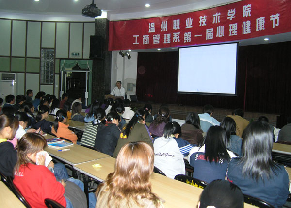 11月29日晚,工商系“心理专家系列讲座”第一讲由温州市心理危机干预中心副主任郑维芳在行政楼多功能厅开讲,并正式启动工商系“学生心理健康节”。本次健康节活动将一直延续到明年5月25日,并在那天达到高潮。