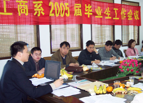 2004年12月5日,工商系在我院分院行政楼四楼举行了“2005届毕业生工作会议”,开始全面启动2005届毕业就业工作。学院就业指导中心郑国波老师,工商系系党政领导、各专业教研室主任及04届、05届毕业班班主任参加了会议。