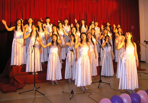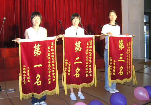 比赛高潮一轮接着一轮,国贸0402班以独特的创意让评委眼前一亮。他们把手语和演唱有效结合在一起,以一曲《感恩的心》折服观众,一举夺魁。营销0301班和企管0301班屈居亚军和季军。