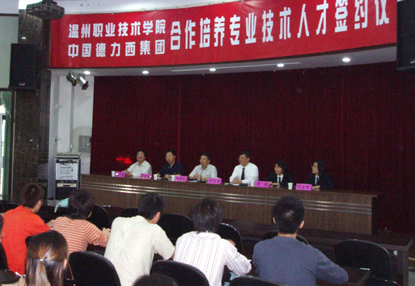 从5月20日开始,温州职业技术学院又多了一个“德力西班”,这是我市低压电气行业著名企业——德力西集团下的人才订单。我院院在学术报告厅与德力西集团举行了“订单式”人才培养合作签约仪式。