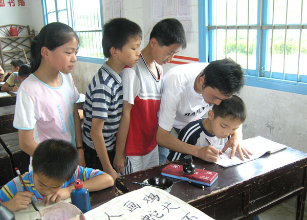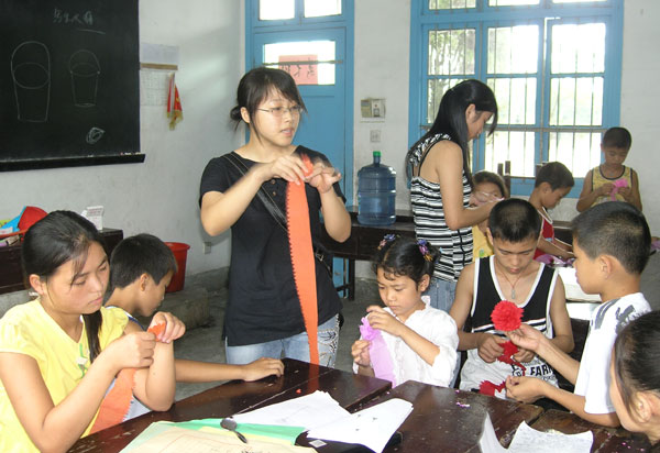 此外,我院在当地举行的义务支教活动也开展得如火如荼,当地几乎所有的小学生倾巢而出,成为了大学生课堂中的“小学员”,书法美术课、艺术品制作课、英语培训课、音乐欣赏课让“小学员”们开阔了眼界,发现了山外精彩的“世界”。