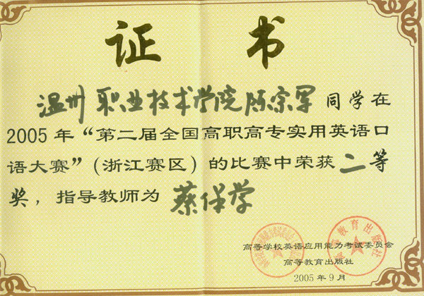 10月15日,在位于杭州下沙高教园区的浙江经贸职业技术学院举行了第二届全国高职高专实用英语口语大赛浙江赛区复赛,我院参赛选手、工商系国贸0301班陈宗军同学以落落大方的台风、机智灵敏的现场表现,荣获二等奖,为学院赢得了荣誉。