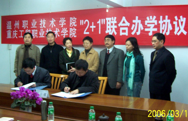 2006年3月10日,我院副院长吴金法一行五人飞赴重庆涪陵与我院教育对口支援结对学校——重庆工贸职业技术学院(原涪陵职业技术学院)举行了对口支援座谈会。在座谈会上,我院与重庆工贸职院就联合办学事宜进行了磋商,并签定了合作办学协议。协议规定,双方学校将举行“2+1”联合办学,即重庆工贸职院2004级机电一体化专业22名学生在重庆完成两年学业后,第三年将转移到我院来培养,我院将负责协助重庆工贸职院推荐这22名学生在浙江省实现就业,以解决西部学生就业难的问题。协议还规定,此“2+1”联合培养模式成功后,双方今后将按此协议长期合作,以切实促进东西部教育间的交流与合作。