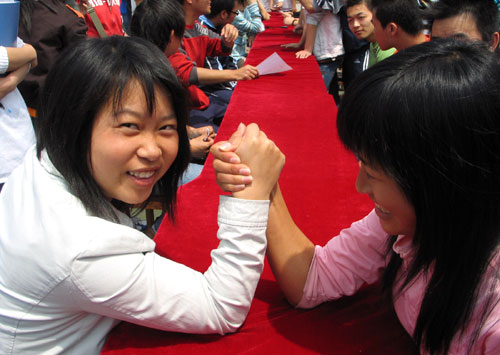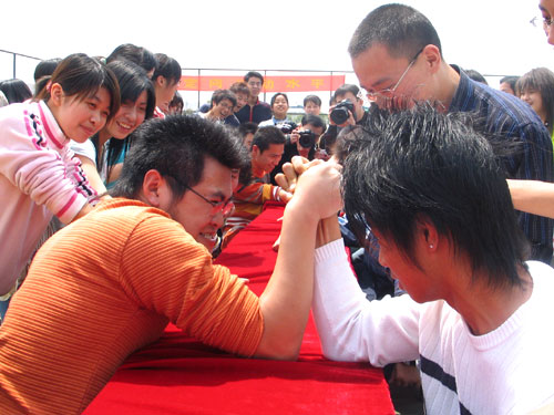4月17日,我院工商系在网球场摆开擂台,展开扳手腕比赛。据悉,该项别开生面的大赛是我院首次举行趣味运动会最具特色的活动之一。活动刚举办,就吸引了40名孔武有力的男生报名参加。最后有六位大力士在比赛中一路过关斩将,夺得“腕力王”称号,成为在场的不少女生追捧的“偶像”。