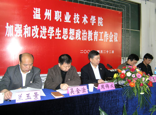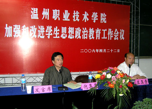 大会还讨论了《温州职业技术学院关于进一步加强和改进大学生思想政治教育的实施意见》、《温州职业技术学院关于进一步加强辅导员队伍建设的意见》、《温州职业技术学院班主任工作条例》、《温州职业技术学院系辅导员学生日常管理实施细则》等四个文件的征求意见稿。