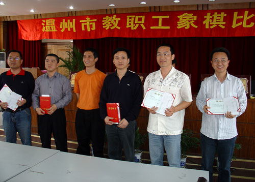 林国荣老师(图左二)获得温州市教工象棋比赛三等奖 5月13—14日,温州市教工“三满意”象棋比赛在温州第二十一中学举行,我院机械系林国荣、电气系贾锦怀、分院倪曼青(女)三位老师参加了比赛。最终,林国荣老师在60多名选手中脱颖而出,获得比赛的三等奖。