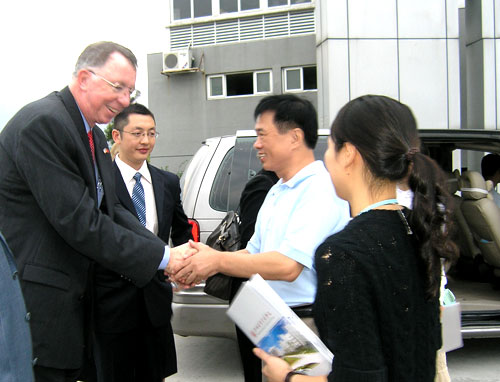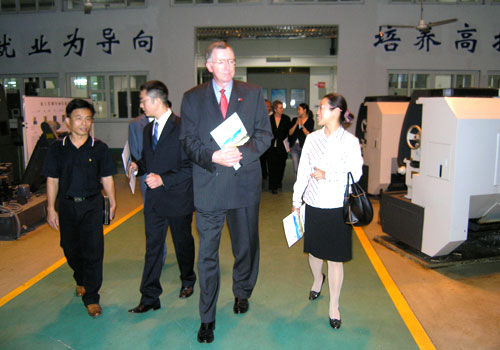 我院党委副书记倪集崇、副院长兰玉景会见了来访的客人。美国客人们参观了我院最具高职教育特色的实训基地——鞋机实训中心和数控中心。在实训基地,美国客人产生了浓厚的兴趣,围绕学生实训情况、就业方向等一些深层教育问题进行了询问和了解。在交谈间,乔瑟夫?博克校长一行对我院的实训基地建设连声称赞。