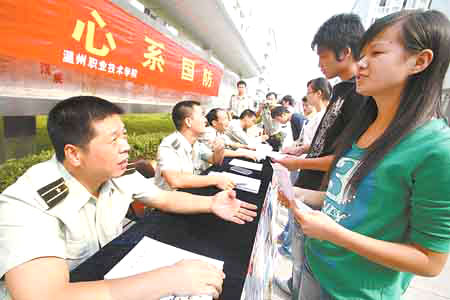 今年是从我院第一次举办此类的征兵咨询会议,同学们关心的问题主要涉及部队待遇、考取军校、报名条件、政审、体检要求,入伍前学业安排、退伍后的复学、以及相关奖励等方面。虽然今年对兵源素质要求较高,但我院学生仍表现出很高的积极性。有同学表示:“当兵是从小的梦想,我们不愿错过这次机会,要让自己的人生更有光彩。”在现场还发现许多怀着“参军梦”的女生。看到咨询现场的火爆场面,瓯海区人武部副部长俞瑞明中校为大学生们能够积极地投入国家的国防事业而感到欣慰。他透露,强调招收高文化素质兵源,继续扩大在校大学生征集数量,是今年征兵工作的一大特点。他表示今年我省将继续扩大高校征兵范围,这意味今冬征兵将对全省的在校大学生敞开大门。