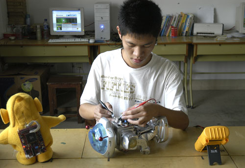 记得要为同学们有一个学习条件,我和创始人盈盈一起去系里申请并策划具体的工作,得到系里的大力支持.系里为我们开放了实验室,安排了住宿.还买了3万元凌阳16位单片机和10个机器人等设备.虽然暑期很热,但是我们却一点也不觉得,大家每天7:30上班,晚上10:00下班.通过这两个月的学习,每个同学都获得很大的进步现在工作室的生活为2006年浙江省大学生电子设计竞赛做准备,<根据基本仪器和主要元器件清单同学们猜题课题目去做模块, 涉及到硬件,软件知识,并且是三个人一起合作一个程序,每个人都有不同的模块需要编写,最后还要合成一个程序,所以必须要有默契和团队合作精神。由于还没有拿到题目所以比赛的前一个星期,我们工作室的同学还要更加努力尽可能把所以需要的模快做出来.在软件部分,我们的一起边学边写,虽然过程是痛苦的,但结果是甜蜜的,当我们击掌庆祝的时候,那些痛苦都已经抛在脑后。