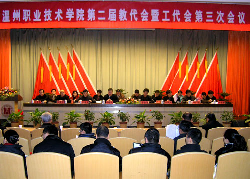 会上,丁金昌院长代表学院作《深化内涵建设 服务和谐社会 办人民满意的高等职业教育》的工作报告;党委书记周锦成就学院“十一五”发展规划(草案)向与会代表们作了说明;计财处处长申屠新飞就2006年度学院财务情况作了通报。
