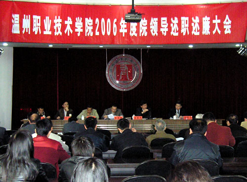 3月5日,我院在行政楼多功能厅举行2006年院领导述职述廉大会。浙江省委组织部干部三处副处长王玉庆、浙江省教育厅干部处副处长王登先、温州市委组织部副部长杜建平、温州市委组织部干部三处处长白炳兴等领导出席了会议并监督评议。省委组织部干部三处副处长王玉庆在会上做了重要讲话。