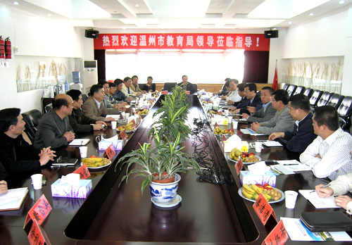 4月9日下午,温州市教育局局长林卫平、副局长谢树华、吴恕成等领导一行12人来我院调研工作。我院领导周锦成、丁金昌、倪集崇、夏晓军、兰玉景、何忠热情接待了市局领导。
