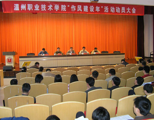 根据省委教育工委、省教育厅和温州市委、市政府的统一部署,为推动作风建设年活动深入开展,进一步查找和解决在思想作风、工作作风、领导作风、生活作风和学风方面存在的突出问题,4月11日下午,我院召开“作风建设年”活动动员大会,全面部署作风建设的任务。院领导周锦成、丁金昌、倪集崇、夏晓军、何忠出席会议。学院科级以上干部、全体党员和教师等参加会议。会议由党委副书记倪集崇主持。