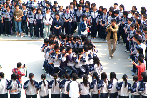 这些同学在干什么?原来他们在进行“人椅”比赛,前面的学生坐在后面学生的腿上,看哪组队伍人多,坚持时间最长……昨天,温州职业技术学院举行“民俗运动会”, 人椅和抬花轿、角斗士等儿时的游戏项目成了运动会项目,这些久违的游戏项目帮大学生们找回了失落的童趣,大家都感到从来没有这么亲近过。相关链接:http://jrzb.zjol.com.cn/html/2007-04/13/content_2429081.htm