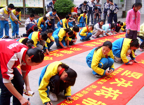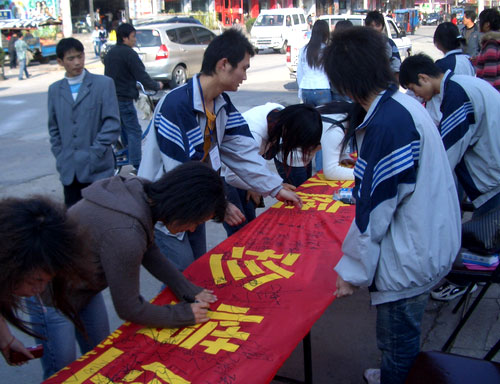 “崇尚科学、关爱家庭、珍惜生命、反对邪教”, 自4月18日以来,我院机械系团学组织把写着反邪教宣传标语的横幅带到茶山小学、火车站、茶山街道、站前东小区、鹿城绣山街道等地开展反邪教万人大签名活动。在签名活动中,同学们纷纷以自己的实际行动表明了反对邪教的决心,他们深入小学生和市民中间分发宣传单,以触目惊心的事例揭露了邪教组织的罪恶本质和卑劣行径,提高了学生和市民对邪教组织的警惕性和防范能力。