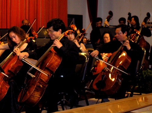 “《中国心》、《梁祝》、《白毛女》等经典曲目震撼人心,被誉为英国第二国歌的《威风堂堂》的确很大气……今晚真实有幸,能够在学校里欣赏到这样的演出。第一次近距离接触交响乐。”在校园中免费聆听完交响乐后,一位大学生在自己的博客写下了这样一段话。5月24日晚,浙江省歌舞剧院交响乐团的艺术家们走进了我院校园,在学术报告厅为师生奉献了一场精彩的演出。一支支中外名曲,把师生带入了高雅的艺术殿堂,让大学生们不出校门免费享受到高雅艺术的熏陶。