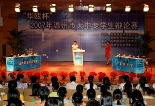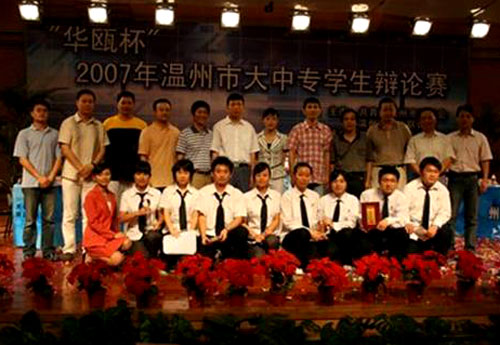 5月26日晚 ,“华瓯杯”2007年温州市大中专学生辩论赛决赛在温州大学落幕。在初赛和半决赛对决中,我院辩论队毫无悬念地轻松击败温州广播电视大学代表队、浙江工贸职业技术学院代表队,一路过关斩将,一直杀入总决赛。在总决赛中,面对东道主、实力强劲的温州大学辩论队,我院作为正方的辩题是《网络进入大学生宿舍利大于弊》,并由此列举了诸多例子,字字珠玑,针对反方提出了尖锐的问题,博得了在场评委和观众激烈的掌声。