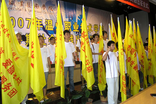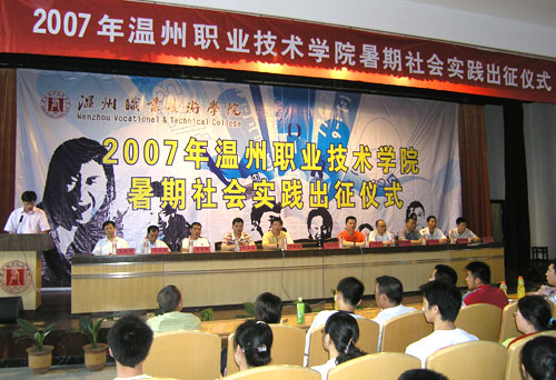 7月6日上午,我院“佳得乐杯”2007年大学生暑期社会实践出征仪式在学院学术报告厅隆重举行。17支院级重点小分队负责人从院领导手中接过社会实践队旗。 “关注留守儿童,共创美好家园”新农村支教实践队、“青春励志,服务农村”新农村建设宣传服务团、“民俗文化探寻”大学生暑期实践队、“春雨育苗”关爱行动大学生支教服务队等、“飞翔计划”二期大学生生存训练体验队等实践队的500余名同学将在暑期深入到泰顺、洞头、乐清、平阳、永嘉等地,进行古建筑、资源探访,民间艺术挖掘,关注留守儿童、农村支教,生存训练、寻访校友等。实践队员们将走进农村,走进海岛,走进社区,走进企业开展丰富多彩的暑假实践,将在烈日下经受考验,绽放青春。