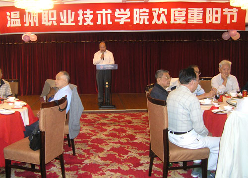 10月19日,农历九月初九,重阳节。为了纪念这个老年人的节日,我院离退休管理处组织离退休干部在松台山上举行登高活动。中午时分,在市区顺生大酒店还举行了庆祝酒会。副院长兰玉景在酒会上致辞,他指出,学院被评选为全国示范高职院校建设单位之后,办学条件和后勤服务越来越好,配套设施建设越来越全,办学质量越来越高,办学特色越来越鲜明。这些发展也凝聚了老领导、老同志多年努力的心血,是我们老领导、老同志给学院新班子打下了坚实的基础。饮水思源,学校将始终传承艰苦创业、艰苦办学的优良传统,把学院建设成一所在全国享有盛名的示范性高职院校。兰玉景副院长向各位老干部致以节日的问候的同时,也希望老干部们们能一如既往地关心和支持学校事业的发展。