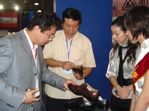 我院副院长王向红亲临轻博会现场,观看了我院的展台。此次,我院除展出糖尿病防治辅助医疗功能鞋外,还展出了固特异高级精品鞋、高效电解用整理装置、SDT系列弹簧扭矩试验机等。这些产品也吸引了不少好奇的目光。