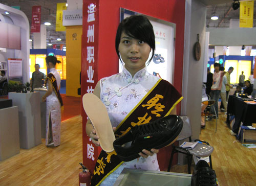 在全国示范高职建设院校——温州职业技术学院的展区放着几十双并不起眼的“普通鞋”,这些鞋子旁边另放了一双鞋垫。就是这些普通鞋子和鞋垫的摊位面前却经常挤满了一些双鬓白霜的中老年人。走近细细一瞧,几位年轻漂亮的轻工系学生模特正耐心地向过往的游客们介绍:“这是糖尿病防治辅助医疗功能鞋。一般来说,糖尿病患者都会出现手或足部经常感到刺痛或麻木、伤口愈合非常缓慢、而且经常发生皮肤化脓性感染等问题。这种鞋垫和鞋面用特殊材料制作,鞋垫里还有是17种药材制作而成,具有帮助糖尿病患者减轻足部的摩擦以及引起足部疼痛的压力,从而防止走路造成的足部溃疡以及损伤的产生,防止感染。现有普通的鞋垫只注重于减轻足部的压力,并没有解决走路产生的摩擦力对足部造成困扰的效果,只会使足部溃疡反反复复。”听完介绍,几名感兴趣的中年人眼睛直发亮,仔细地边看边摸鞋子和鞋垫,发现这鞋和鞋垫的确区别于普通的鞋和鞋垫。也有人要提议订购几双,却被学生模特婉言谢绝了。原来这鞋是由我院轻工系鞋革研发中心研发的,现已经申请专利,但还未正式投入生产。在摊位现场,还发现一些皮鞋生产商对这此非常感兴趣,两天来有10多家皮鞋生产商和经销商向温职院轻工系抛来了“绣球”,要求合作研发、生产。