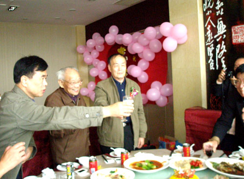 祝寿会上喜气洋洋,金色的寿字在粉红色的气球衬托之下熠熠生辉,这次到会的有70岁、75岁、80岁、85岁等13位寿星。寿星们个个胸佩鲜花,显得神采奕奕,大家频频举杯敬酒,互祝彼此健康长寿,生活幸福,并祝愿学校的事业越来越火红。离退休管理处还为每位寿星拍了照,还分发了“长寿面”礼券。