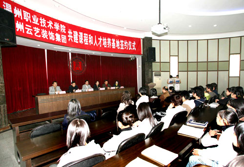 11月27日,我院轻工系与温州云艺装饰设计院签订了“校企合作、共建课程”的协议,自此拉开了我院进行大规模工学结合的课程改革的序幕。我院丁金昌院长、王向红副院长以及温州云艺装饰设计院院长周胜敏、设计总监马继良总工程师出席了签约仪式。