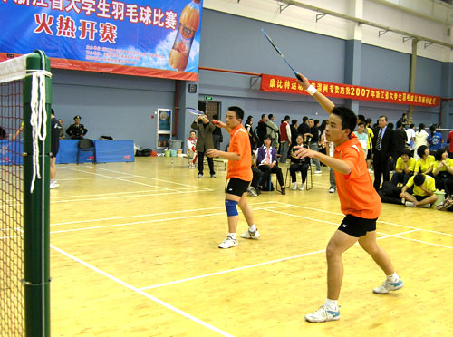12月10日,2007年浙江省大学生羽毛球在温州医学院落下帷幕。我院参赛选手表现出色,共夺得二金一银两铜。其中,我院马海龙、葛晨强、章春常、林良成、章朝旭五人荣登男子乙组团体冠军宝座,马海龙/葛晨强合作获得了男双冠军、马海龙摘取了男子单打亚军,在男子项目,我院大包大揽,打出了温职院运动员的气势和良好精神风貌。我院周晴、赵莉莉、金华丹、施小影四名同学也发挥了水平,获得了女子乙组团体第三名,周晴/赵莉莉还摘取了女子双打第三名。此外,我院公共教学部严小娟老师还被大会组委会评选为“优秀教练员”。