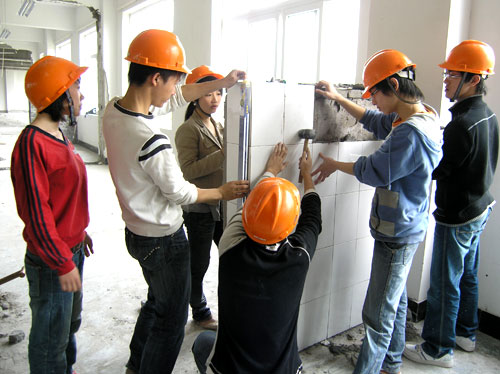 量尺寸、放砖、拉线、砌墙、贴瓷砖……3月28日上午,我院建工系建经0601、0602班的80多名同学在我院近日准备改建的实训楼建筑工地中五人一组一字排开,学习砌筑墙体、装饰墙体。学校的建筑工地立刻成了建筑专业学生的绝佳实训场所。实训指导老师纪定峰站在一旁,一边指导一边提问:“砌墙场的安全细则是什么,如何目测墙体的垂直度?……”同学们一边按照理论课上老师的要求有条不紊地进行操作,一边准确地回答老师的提问。