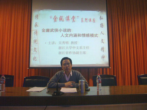 在讲座中,吴教授着重从金庸“政治活动家、报人、武侠小说作家”三重身份的角度,对其武侠小说中的人文内涵和情感模式进行了具体的剖析和阐述,见解独到、细致。他从武侠小说不同时期的发展历程中描绘出了金庸小说的发展特点,通过各个角度深刻剖析了金庸武侠作品在特定的历史环境下的文学性、社会性,并且他认为金庸先生是借武侠表达他强烈的政治情怀。同时,吴教授还把金庸先生同梁羽生、古龙这两位武侠作家作了对比,阐述了金庸小说的独特性与开阔性。他深刻指出,金庸小说也有其不可忽视的局限性,读者在阅读金庸作品时不应把它“神化”。吴教授强调了武侠小说的社会功用是消遣、调节及情感满足,在座的同学对武侠小说有了更清晰的认识。