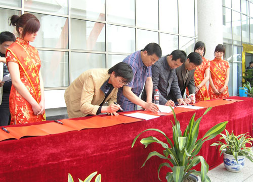学院领导与各系书记为本次文化题词 4月9日,我院2008年创业艺术文化节暨社团创新创意文化节在学术报告厅中心开幕。副院长夏晓军,学生处、团委全体老师,各系书记、辅导员以及学生代表近400多人参加了开幕式。