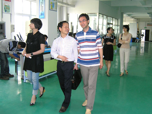 应处长了解我院学生的专业实训及学习情况 5月5日,温州市教育局高教处处长应元涨来我院调研,丁金昌院长陪同视察了我院独具特色的生产性实训基地。