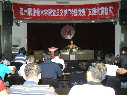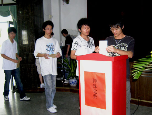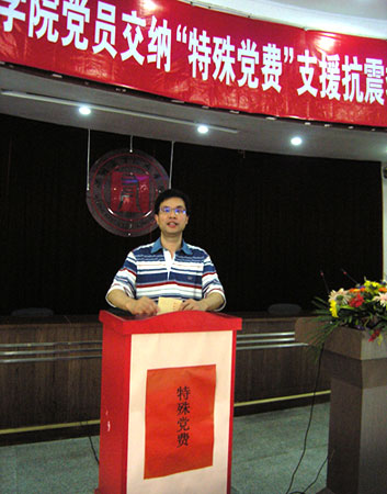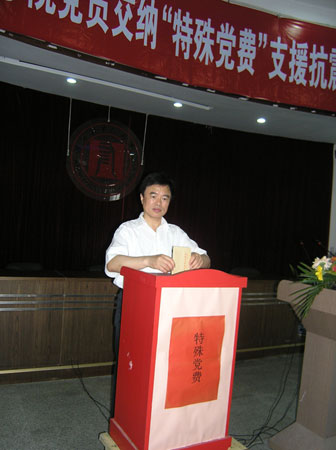 学生党员交纳“特殊党费” 5月27日,我院党员、干部积极响应中组部号召,在全院师生捐款的基础上交纳一次特殊党费,以实际行动支援抗震救灾工作,为灾区人民重建家园贡献自己的力量。
