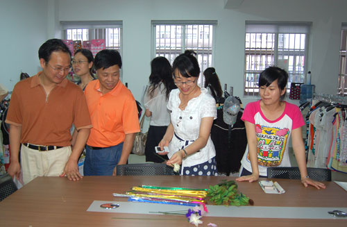 在我院创业精品园参观时,客人们对我院提出的“三园”理念,即我院把创业园分为精品园、商贸园和草根园非常感兴趣。在服装设计工作室里,几位创业学生还向客人们热情介绍起了几款自己设计的衣服以及DIY鞋(自己动手设计的鞋子)。浙江省高校毕业生就业指导中心主任陈龙春还现场在自己主编的书上签名勉励一位创业学生。