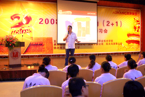 服装专业教师项敢传授商品陈列与展示知识 8月20日—24日,我市著名民营企业——奥康集团200多名员工入驻校园,举行了“2008年赢在长三角营销精英培训会”。在培训过程中,员工们住学生公寓、吃学校食堂,早起出操,夜晚统一熄灯入寝,再次尝试了大学校园生活。据培训会负责人介绍,本次奥康集团组织员工进大学校园培训,就是为了让员工能够再次体验大学校园生活,接受我院校园文化的熏陶。