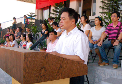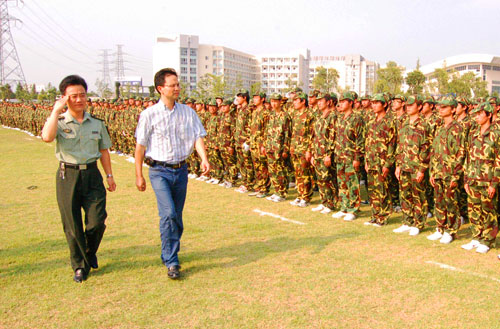 党委副书记倪集崇勉励同学们 2008年9月20日是我国第八个国防教育日,我院在田径场举行2008级新生军训汇报表演,以此来增强当代大学生的国防意识和国防素质。院领导丁金昌、倪集崇、夏晓军、兰玉景、何忠出席观看了此次军训汇报表演,并为军训先进集体、先进个人颁发了荣誉证书。副院长夏晓军主持了汇报会。