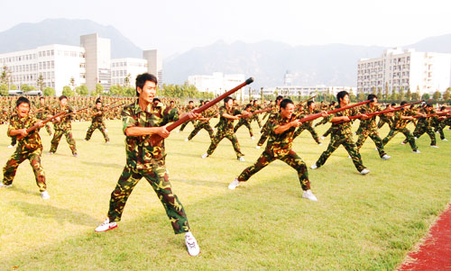 汇报表演前,院长丁金昌在部队首长的陪同下检阅了2008级新生组成的40多个军训连队。新生们以饱满的精神状态、昂扬的斗志进行了分列式表演。他们队列整齐,步伐统一,英姿飒爽,意气风发,表现出新一代大学生良好的基本素养和精神风貌。在分列式表演后,新生同学还表演了刺杀、战场救护、格斗等军事技能。