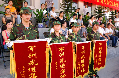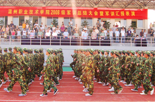 副院长蓝玉景宣读了《关于表彰温州职业技术学院2008级学生军训先进集体和先进个人的通知》。据悉,本次军训中,电气系等四个军训营被授予“先进集体”称号,人文系温娇蓉等100多名新生获得“军训先进个人”称号。