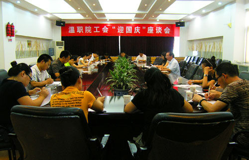 9月26日下午,院工会召开工会“庆国庆”座谈会,喜迎国庆五十九周年,研究探讨新时期工会工作,并学习丁金昌院长《立足温州区域特色,培养高技能人才》的报告精神。座谈会由院工会副主席林建华主持,各工会小组长参加了座谈会。