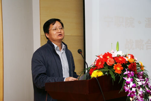 庄华洁在致辞中表示对宁职、温职、杭职三校战略联盟、强强合作的做法非常感兴趣和钦佩。她指出,浙江省的高职教育发展水平和办学特色在全国都是位居前列,而今天两所国家示范院校、一所省级示范院校的联盟是一种创新,必将产生新的办学理念和全新的带动、引领作用,甚至在全国闯出一条新的路子。同时她认为,杭、宁、温三地的经济模式极具互补性、借鉴性,三校在办学模式、育人模式上也可相互借鉴,优势资源共享,并在国家示范带动引领下,多探讨浙江省示范高职院校的建设与发展,进而推动全省47所高职院校的建设,为浙江省经济转型、产业提升提供更多的实用型一线技术人才。最后,她希望三校联盟早结硕果。