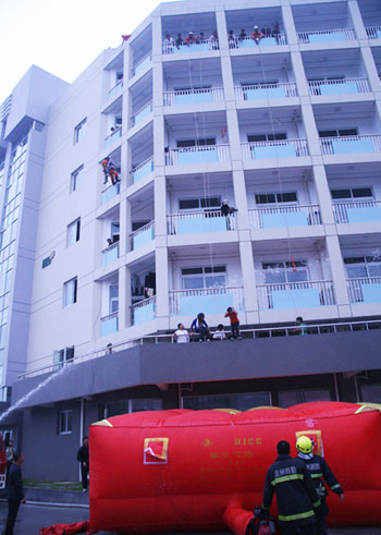 “着火了,赶快撤离!”伴随着呼叫声,我院M幢学生公寓有两处宿舍里冒出滚滚彩烟,被困在房内的学生在尖利的警笛声中纷纷跑向阳台挥着红布条求救。这不是真的火情,而是11月5日下午三点,在温州职业技术学院校园内举行的一次消防演习。