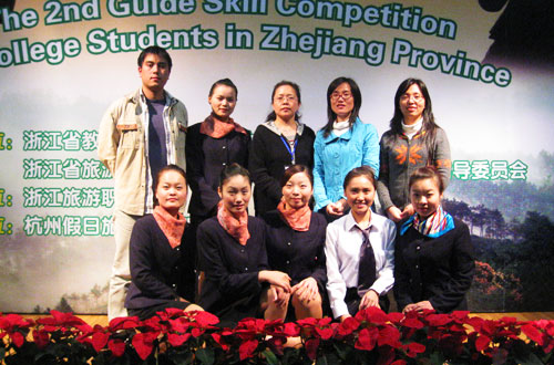 参加导游比赛的选手与指导老师 11月8日,由省教育厅、省劳动和社会保障厅、省旅游局、省测绘局共同主办,在杭的10所高职院校共同承办的2008年浙江省高等学校学生职业技能大赛隆重开幕。本次大赛根据高职院校学生和专业特点,按照“企业最需要什么就赛什么”的原则,确定了工程测量员、化学检验工、服装设计定制工、动漫设计(动画绘制员)、室内装饰设计员、电子制作、国际商务、企业经营管理沙盘技能、导游、护理等10个职业(工种)作为竞赛项目。来自全省各地315支代表队的1108名选手参加了比赛。