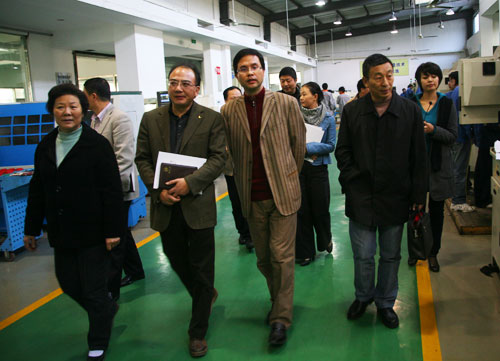 交流会后,丁金昌院长陪同客人们还参观考察了我院国家示范性数控实训基地、精密模具生产性实训基地,浙江省示范性制鞋工艺实训基地等校内实训基地。参观中,丁院长还结合实训基地建设的理念与客人们共同交流了高职教育发展定位和人才培养目标。