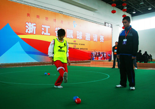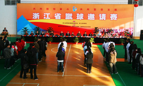 选手在比赛中 12月8日,2008年浙江省蹴球邀请赛在我院开幕。浙江省民宗委副主任陈智慧、省体育局副局长应祖明、温州市委常委统战部部长余梅生、我院副院长兰玉景等出席了开幕式。余梅生部长在开幕式上致欢迎辞。