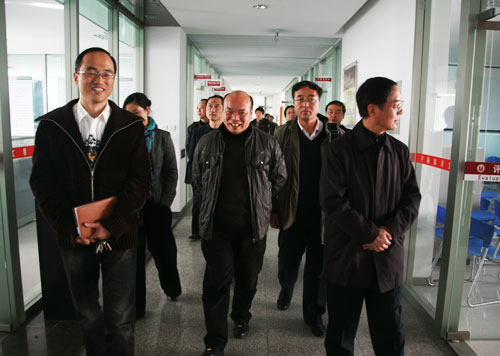 参观建工系实训基地 12月10日上午,浙江工商职业技术学院院长蔡泽伟、副院长姚奇富一行就示范建设工作来我院考察。座谈会在行政楼三楼会议室召开。丁金昌院长、兰玉景副院长及相关职能部门负责人出席座谈会,并热情接待了来访的兄弟院校客人。